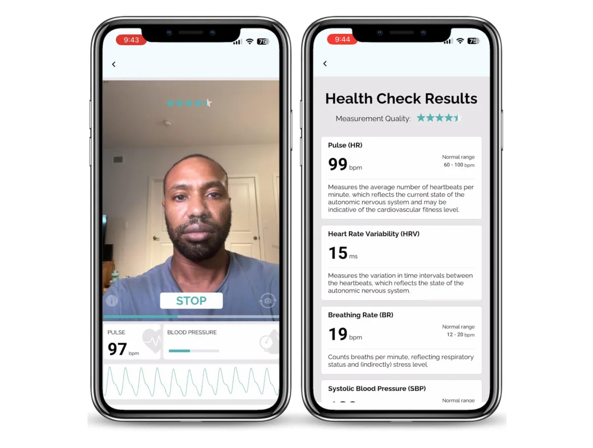 A biometric facial scan analyzes physiological data to measure vital health indicators. It provides outputs such as pulse, heart rate variability, breathing rate, blood pressure, stress index, parasympathetic activity, cardiac workload, and BMI.